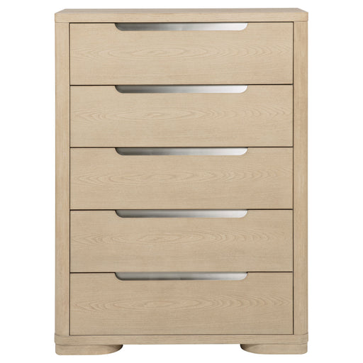 Coaster Z2 PremiumThis five-drawer chest offers a balance of style and storage with its light elm finish and brushed nickel fingertip pulls. Rounded corners enhance ...