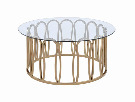 This round coffee table features a clear tempered glass top supported by a durable metal frame. The base is finished in a striking electroplated ch...