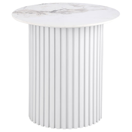 This round end table features a sophisticated sintered stone top with natural veining for a modern and luxurious touch. The sturdy metal base, with its fluted design and white powder-coated finish, delivers both stability and sleek aesthetics. Compact yet impactful, this versatile piece complements a variety of living spaces, offering style and functionality. Designed for everyday use, it seamlessly combines durability with refined design for contemporary interiors.