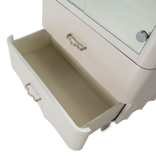 Ashley FurnitureThe epitome of fashion-forward design, this nightstand is a beautiful blend of comfort and luxury. Shiny chrome-tone accents, a pearlized finish an...