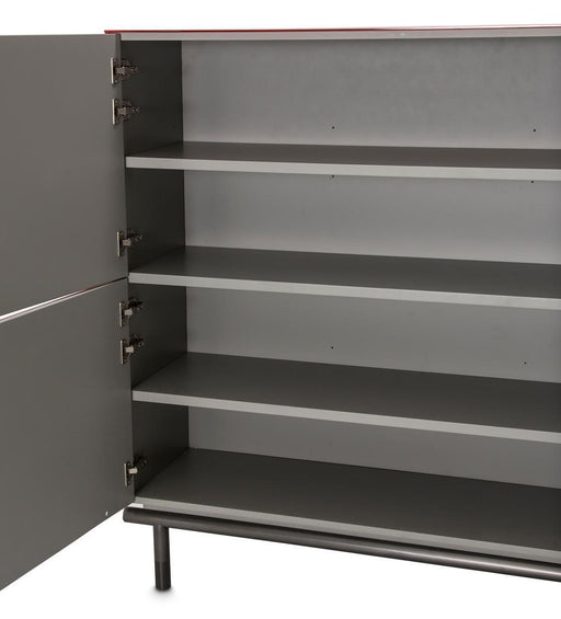 21 Cosmopolitan Collection by Aico Furniture Orange and Umber finish 4 Drawers 2 Doors Shelf behind both doors All drawers have soft closing glide...